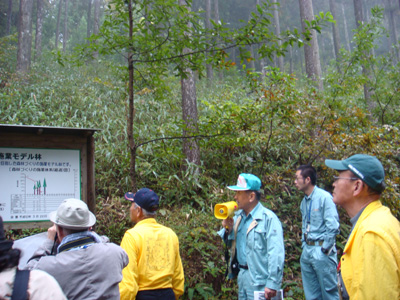 「浜口幸弘氏とその林業の概要」というパンフが配布されそれに基づき説明がありました。浜口氏は嶺北消防署に勤務するサラリーマン林業家で、すべての森林作業や間伐生産事業(集材架線の架設まで)を「一人作業」システム化を創意工夫し、休日や非番日を利用して、長伐期/複層林施業を、労働生産性4m3/人・日で事業を行っているとのこと。面積約30ha、人工林率98%(スギ、ヒノキ、クヌギ)、林内路網密度210m/haといった経営体森林(40年生)から過去4回の間伐によって4,000万円の収入をあげているとは驚きでした。樹冠率50%を理想とする定性間伐(間伐率50%程度)を繰り返しているという、その林分を見学して、浜口氏の理想が着実に実現されていることを直に見ることができました。その林分には案内板「豊かな森林(もり)づくり施業モデル林」が立てられており、浜口氏の実施している育林施業体系が示されていました。浜口氏のモットーは「健康、やる気、段取り」と、「説明責任(森林所有者がどのような森林管理をしているのかを一般住民に説明する責任)」を果たすことであるとのこと全く感心しました。