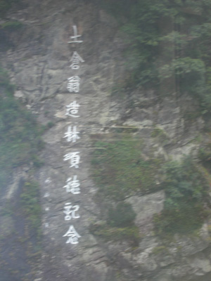 突然、前方吉野川の対岸に「土倉翁造林頌徳記念」と白い文字で刻まれた鎧掛岩が出現した。一文字の大きさは2m四方、刻字の深さ36cmとのこと。土倉庄三郎は、吉野林業の中興の祖といわれ、「吉野林業全書」を出版し、「土倉式造林法」を確立し吉野式造林技術を全国各地に広めると共に、自らも植林事業を進めたとのこと。また、筏師の生命の危険減少・筏流送の能率向上の為、吉野川の改修を行ったり、道路の開設・改修(現在の国道169号他多数)を行たという。さらに、私費により小学校(川上村大滝・西河)を開校し村内の子供の教育を進め、明治初期、自由民権運動に資金を援助し政治にも多額の献金を納め社会的にも有名な人であった。1900年当時の首相(山縣有朋)から還暦祝として「樹喜王の称号」を送られたとのことである。進行方向道路の右側、旧土倉邸跡に土倉翁の銅像が建っていた。