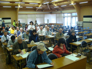 ウッドピア市売協同組合の事務所のある建物の前でバスを降り、会議室へ通される。そこで、理事長の中川氏から 「ウッドピア松阪」の概要について、原木市売りを中心に話を聞く。原木市売り毎週水曜日、月に一度の特別市を開催しているとのこと。取扱量は年間スギ4.2万?、ヒノキ3.8万?程度で、原木は100%捌けてはいるが、価格は昨年に比べて下降状況にあるとのこと。原木の供給は4社が中心で、森林組合連合会や全国からも持ち込まれ、売れ先も全国的であるとか。全体的な施設整備は未だ推進中で、バイオマス関連は平成21年から稼働予定であるとのこと。