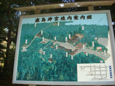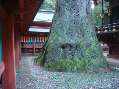 15:30頃予定通り、常陸国一の宮である鹿島神宮に到着。一行は、大鳥居、楼門を通って社務所に向かう。そこで神宮参拝係の小林さんからの挨拶を受け、先ず本宮本殿裏の杉の大木・御神木に案内されました。樹齢推定千二百年、胸高周囲10m、高さ43mの大樹である。本殿の裏の神域内に鎮座していて側によることは出来ない。この御神木は、鹿島神宮樹叢に生育する約三百本の巨樹・巨木(胸高直径1m以上のもの)の中で群を抜いて高く太いもので、北条時鄰著「鹿島志」(1823年(文政6年)発行)にいう「厳の鉾杉」であるとのこと。一般参拝客はここまで入れないので、参道から仰ぎ見るだけで、その高さ、太さは、楼門の付近にある次郎杉(御神木に次いで高樹齢の杉、樹齢約700年、樹高40m、胸高周囲6m)から実感してもらっているとのこと。鹿島神宮境内には約200本の杉の巨樹(胸高直径1m以上)があるそうです。