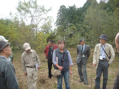 昼食の後、NPO法人さんむ環連協理事の高橋明美さんとその仲間が参じて下さった。「さんむ環連協」は、千葉県里山条例が制定された後に設立されたNPO法人(平成14年2月NPO認証)で、環境保全、環境啓発活動を目的としているそうです。高橋さんの説明によると、「さんむ環連協」の具体的な活動は、里山保全整備、環境監視パトロール(不法投棄の防止)、残土埋立・山砂採取阻止、自然学習、環境啓発等だそうです。このうちの「里山保全整備活用活動」では、千葉県里山条例に基づき山林所有者と里山協定を結び、里山の全伐、間伐、下刈り、植栽を実施しているそうで、対象山林は小学生等の自然学習の場としても利用させてもらっているとのことです。現在は25名の会員で土・日曜日に活動をしているそうで、里山提供者の募集に努力しているとのことでした。このようなお話しの後、実際の活動現場2カ所に案内して頂きました。最初は、平成16年に里山協定を結び、約1haの里山(実際には舗装道路際)にヤマザクラ、ヤマグリ、クヌギ、ナラ、ヤマボウシなど10種の落葉樹を1,600本植えた現場で、年3回の下刈りを行っているそうです。苗高15cm位の苗木を植えた現場は背丈3m位に成長していました。会の皆さんに見守られて立派な里山広葉樹林へ成長するものと思われました。2カ所目は、会員同士の親交と交流の場建設のためのツリーハウス建設現場です。67年生の民有林内の眺めの良い所にツリーハウスが建築中でした。写真に示すようになかなかの傑作でありこれからの楽しみを期待しながら、一同NPOの皆さんと別れて、二泊目の勝浦ホテル三日月へ向かいました。